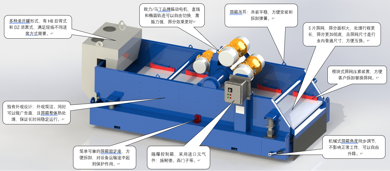 北鉆固控高頻干燥振動篩是結(jié)合國內(nèi)外泥漿不落地市場需求及環(huán)保領(lǐng)域的要求自主研發(fā)的一款高激振強(qiáng)度的泥漿振動篩,高頻干燥振動篩能夠滿足各種鉆屑廢棄物脫水、篩分、凈化等要求。高頻干燥振動篩是保證整個鉆屑尾漿處理持續(xù)有效進(jìn)行的必不可少的重要設(shè)備,直接將鉆井過程中振動篩、除砂器、除泥器排出的廢棄物進(jìn)行干燥處理,干燥后可實(shí)現(xiàn)固相干堆處理。北鉆高頻干燥振動篩可根據(jù)客戶的不同處理要求進(jìn)行特殊設(shè)計(jì),以滿足國家對各類礦山,鉆探,水處理等工程的環(huán)保要求。 GBZS系列高頻干燥振動篩技術(shù)參數(shù) 型號 GBZS584 GBZS585/GBZS585S 振動軌跡 直線型/雙軌跡 處理量 140m³/h 165m³/h 電機(jī)功率 2×2.2kW/2x2.2+1x1.3kW 篩網(wǎng)數(shù)量 4 5 篩網(wǎng)規(guī)格 585×1165mm 585×1165mm 激振強(qiáng)度 ≥8.0G 雙振幅 5.0~6.5mm 篩箱調(diào)節(jié)角度 -1°~4° 噪音 <85db 防爆標(biāo)準(zhǔn) ExdIIBt4/IECEX/A-TEX 重量 1530kg 1950kg 外形尺寸 3080×1960×1424mm 3597X1978X1415mm 備注 以上處理量供參考,依據(jù)不同的篩網(wǎng)目數(shù)和泥漿狀況會有不同。 GBZS系列干燥篩優(yōu)勢圖示 北鉆高頻干燥振動篩的特點(diǎn)和優(yōu)勢: 1.激振強(qiáng)度高達(dá)8.0G,而且可以調(diào)節(jié),能夠有效的干燥鉆屑; 2.篩箱整體熱處理,能夠滿足高激振強(qiáng)度下長時間穩(wěn)定工作; 3.電控箱內(nèi)裝的熱繼電器有過載和缺相保護(hù)功能; 4.運(yùn)動軌跡為直線型,振幅大,運(yùn)動速度快,能快速的進(jìn)行固液分離; 5.漏斗式進(jìn)料方式的設(shè)計(jì),有效的降低了進(jìn)料高度,方便輸送機(jī)的進(jìn)料; 6.采用國際知名品牌振動電機(jī),意大利OLI電機(jī)或者美國Martin電機(jī); 7.主要電器元件選用西門子,施耐德或者ABB等品牌;