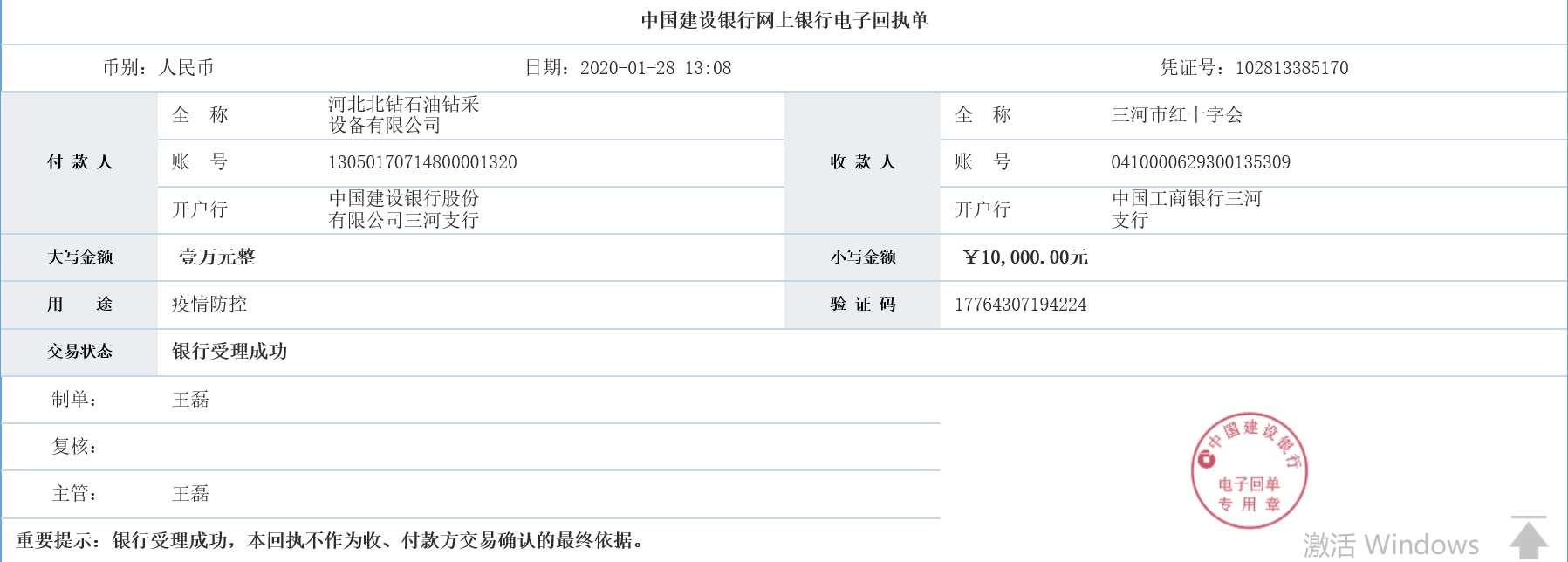 2020年1月份湖北省武漢市爆發的新型冠狀病毒突如其來的肆虐八方,是全國人民始料未及的。親眼目睹病毒肆意蔓延,被感染者痛不欲生,北鉆固控全體人員倍感痛心。雖然我們北鉆固控是新成立不久的公司,但是我們北鉆人也深感自身肩負著的社會責任感與使命感,決定向紅十字會捐款人民幣10000元略盡微薄之力。